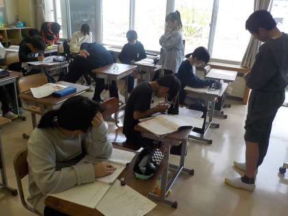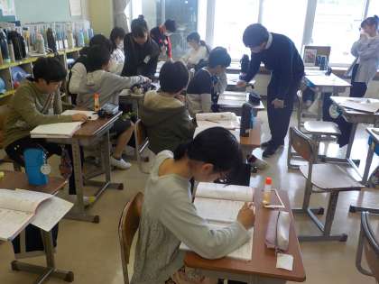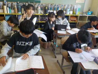 6年生は算数科「対象な図形」の単元で、自由進度学習に取り組みました。子供たちは自分なりのペースで問題に取り組み、友達と対話しながら学習を進めました。