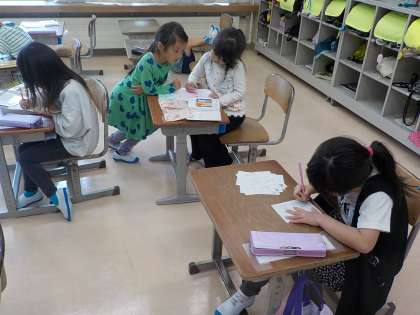 名前と好きなものを書いて名刺を作り、自己紹介をしながら職員に渡しました。