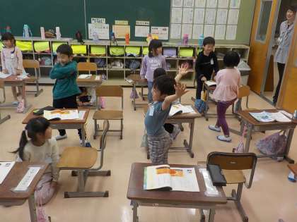 おひさまが「のっこり うみからおきだした」という叙述をもとに身体表現しました。