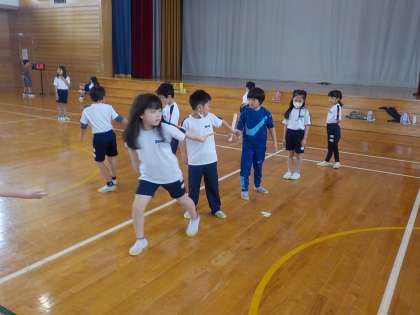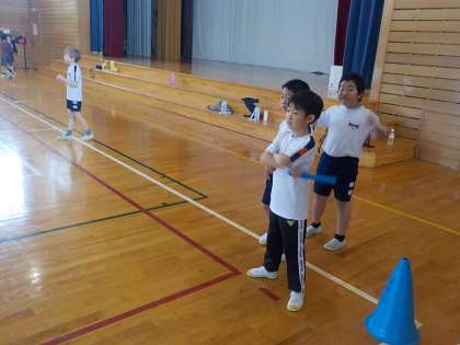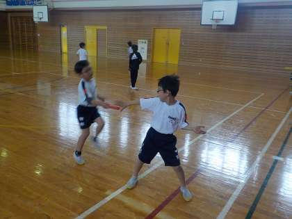 リレーのバトンパスの練習をしました。声をかけてバトンを渡すように気を付けました。