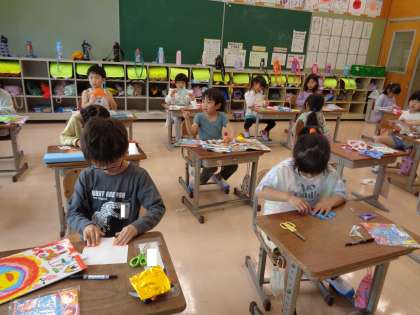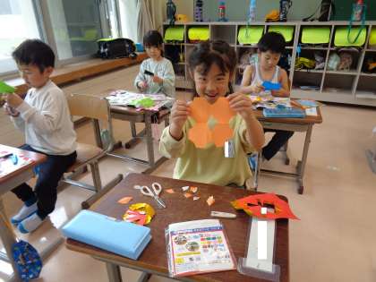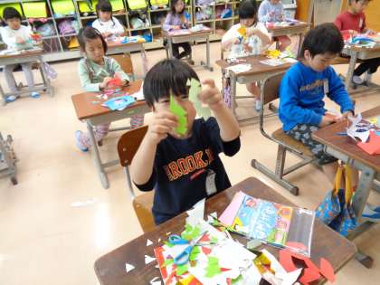 「ちょきちょきかざり」の学習の様子です。折り紙をはさみを使って切り、いろいろな飾りを作りました。飾りを作ることに熱中していた子供たちでした。