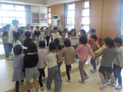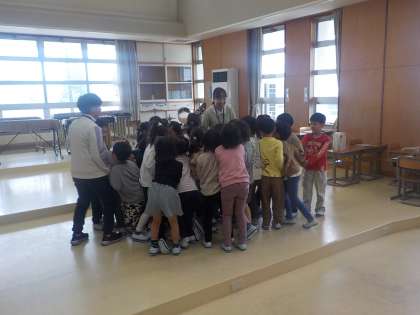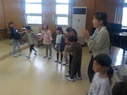 学年合同で音楽の学習を行いました。「ひらいた ひらいた」等、歌唱と身体表現をしながら学びました。