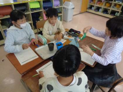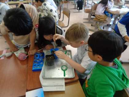 4月の終わりにたねまきしたものの芽がではじめたので、観察しました。ホウセンカやヒマワリの成長がよく分かりました。葉の数や高さ等に注目して記録することができました。これからの成長が楽しみですね。