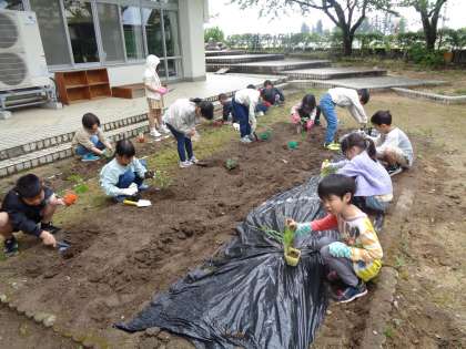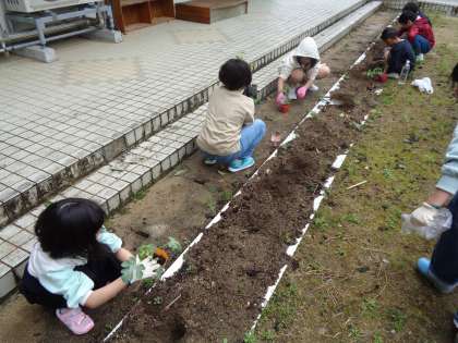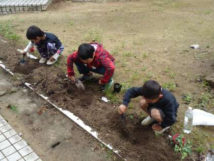 雨上がりで風も冷たい日でしたが、子供たちの「植えたい」という熱意に押されて、野菜の苗や種を植えました。