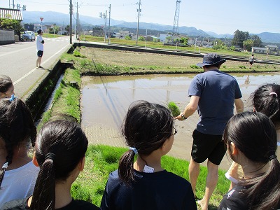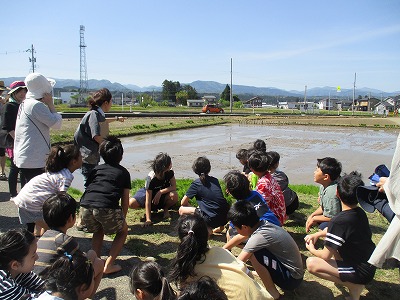 今日は天気も良く、田植えにぴったりの日になりました。 説明を聞いて、いざ開始です。