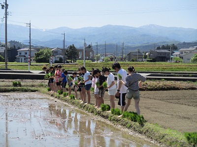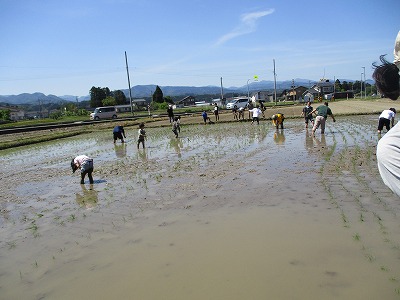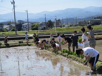 はじめは素足で田んぼに入るのに躊躇していましたが、いざ入ってみるとみんな楽しく作業にかかっています。