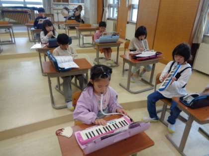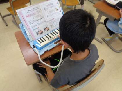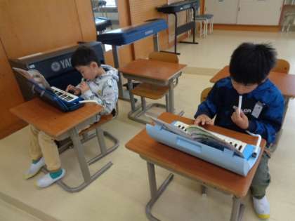 音楽では、鍵盤ハーモニカの演奏に取り組みました。息を吸うタイミングをそろえて音を合わせられるように意識して練習しました。練習の最後にはピタッと音がそろえることができました。これからもいろんな曲を演奏しましょう。
