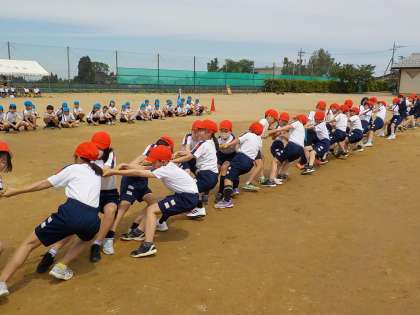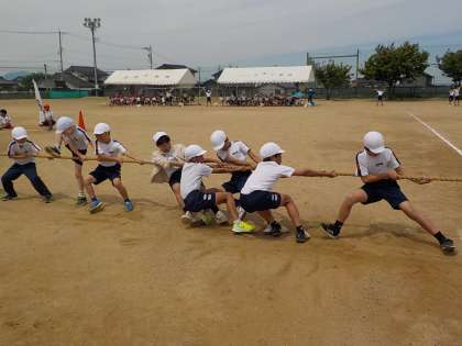 上学年の団体競技は綱引きです。声を合わせて力一杯綱を引きました。