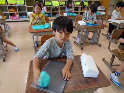 粘土を使った学習の様子です。初めて粘土を使う日だったので、粘土体操から始めました。粘土のかたまりを細かくちぎったり、丸めたり、伸ばしたりして粘土と仲良くなりました。とても楽しそうに取り組んでいました。