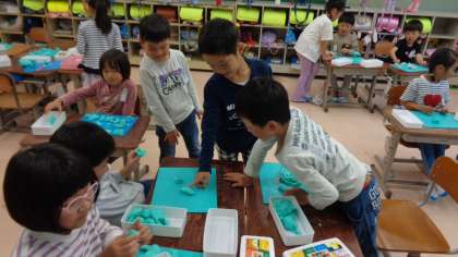 今日はねんどで色々な「ごちそう」をつくりました。みんなとても楽しそうにつくっていて、完成したものを友達同士で見合いっこしました。