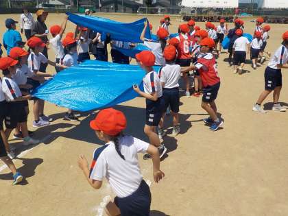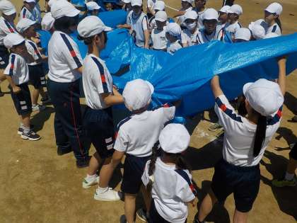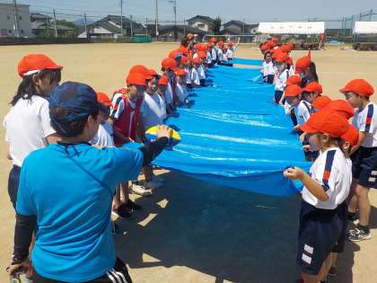 ファミリー班競技です。ブルーシート上にラグビーボールを乗せてリレーのようにつなぎました。