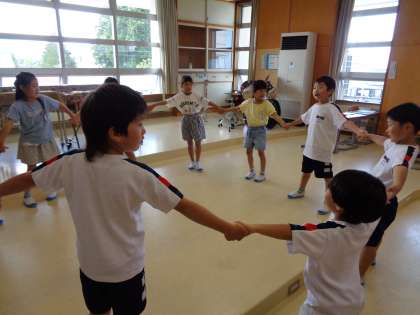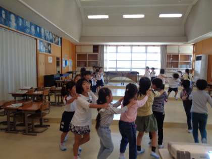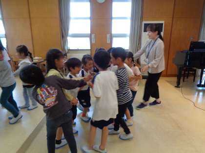 音楽の学習の様子です。「ひらいた ひらいた」の曲では、円になって開いたり閉じたりしました。「さんぽ」の曲では元気に楽しく歌って歩く様子が見られました。いつも楽しく音楽の授業をしている1年生です。