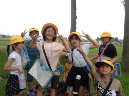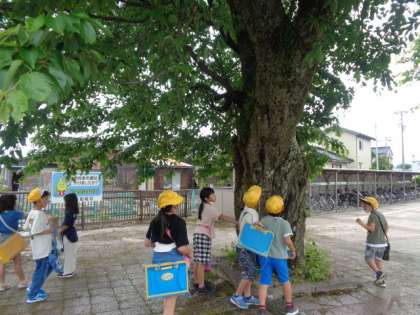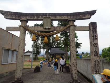 大庄駅に大きな桜の木がありました。そのあとは田畠神社に行きました。冬になると水が出る場所があるなど、知っていることをたくさん話してくれました。