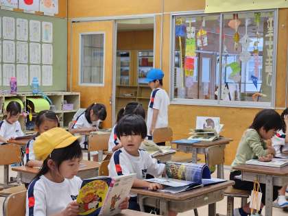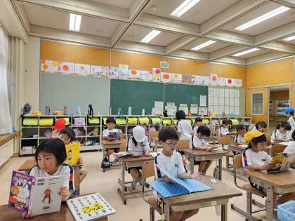 水曜日のチャレンジタイムは読書です。興味のある本を手に取り、集中して読書をする様子があります。最初は、声に出して読んでいた子も、だんだんと黙読ができるようになってきました。