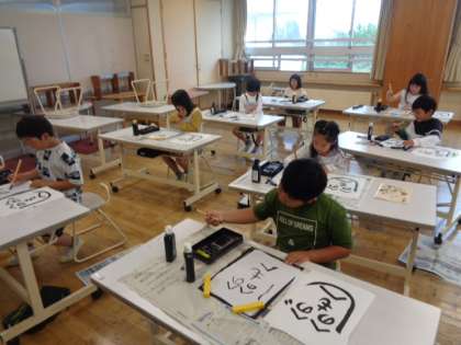 今日は初めて墨を使って半紙に書きました。良い姿勢を意識して、墨をつける量にも気を付けながらていねいに書きました。まだまだ難しいようですが、これから練習を重ねて美しい字が書けるようになるといいですね。