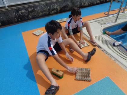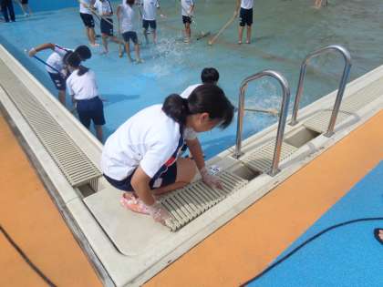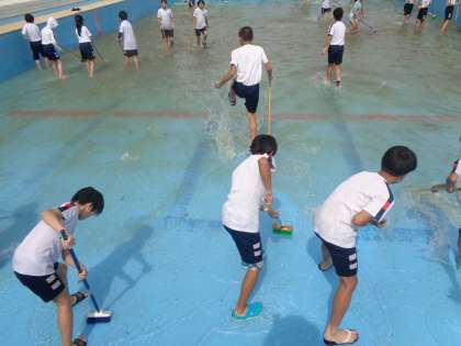 今日は、プール清掃でした。今年度の水泳学習で、全校のみんなが気持ちよくプールを使えるように、一生懸命掃除をしました。まずは周りの溝から。タワシでこすってきれいにしていきます。