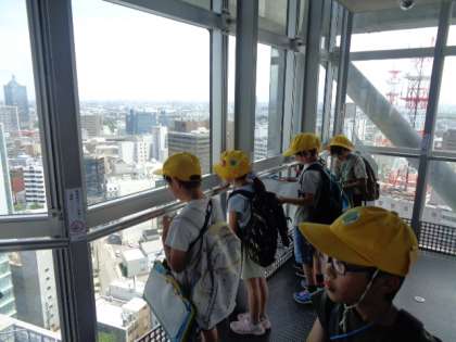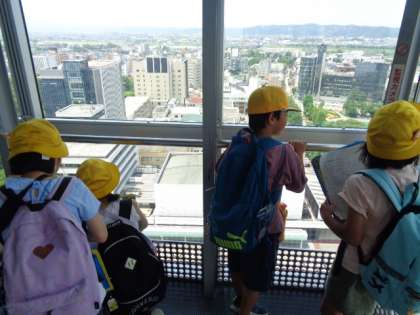 次に、市役所の展望台へ行きました。方位を意識して山側や海側の違い、駅の方の様子等を観察しました。近くから遠くの方まで広い視野で観察することができました。