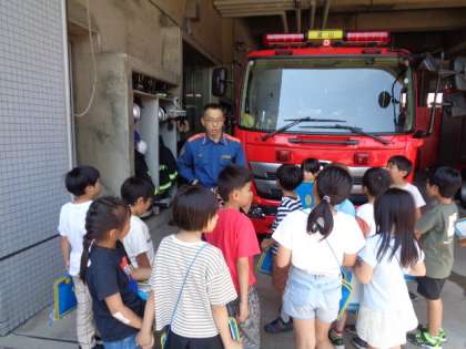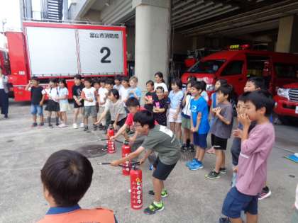 消防車を見たり、訓練の様子を見たり、消火体験をしたりしました。