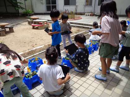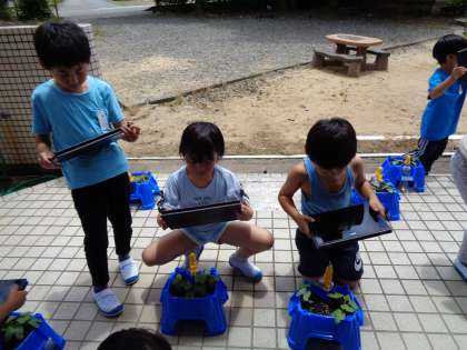 あさがおの観察をしています。ワークシートに絵を描く方法と、クロームブックを使って写真を撮る方法の両方で記録しています。茎が伸びて葉がとても大きくなり、子供たちは喜んでいました。