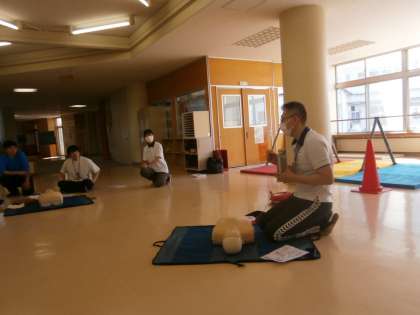 日本赤十字社富山県支部の方2名を講師にお招きし、AEDを用いた心肺蘇生法や応急処置について実践方の研修を行いました。