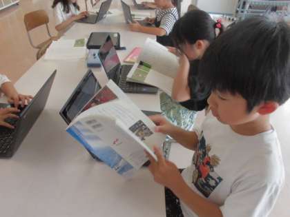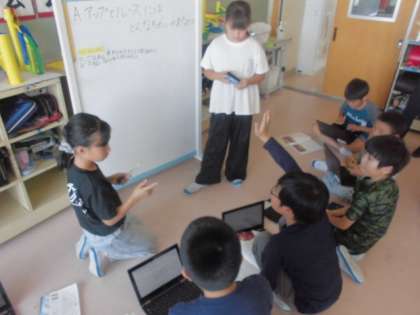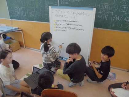 自分で作った問いの答えを教科書を読んで探したり、みんなで決めた問いについて、ホワイトボードを使って話し合いをしました。