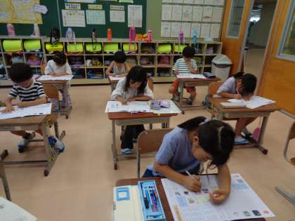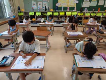 ひらがなの学習の様子です。良い姿勢と正しい鉛筆の持ち方で取り組んでいます。静かに集中した雰囲気の中で、真剣に学習している子供たちです。