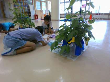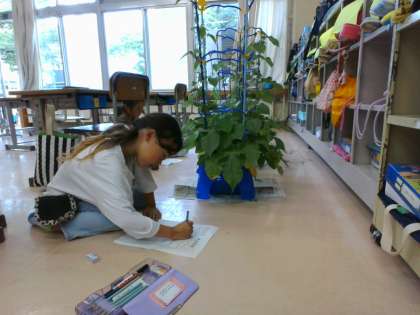あさがおの花が咲きました!毎日のお世話のおかげで、あさがおの花が咲き始めました。濃い青や水色、紫の花がちらほら見られます。まだ花が咲いていない子供も、つぼみが膨らんできたことを実感していました。今日は前回との違いをワークシートに記録しました。