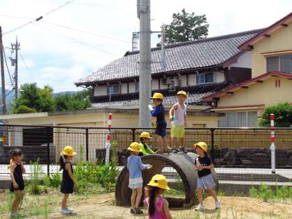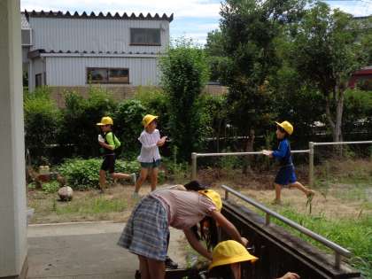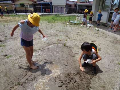 しゃぼん玉遊びに続けて、水遊びもしました。ペットボトルや調味料の容器に水を入れて遊びました。ずぶ濡れになるくらい友達と水をかけ合ったり、水を土にかけて水路を作ったりして楽しみました。