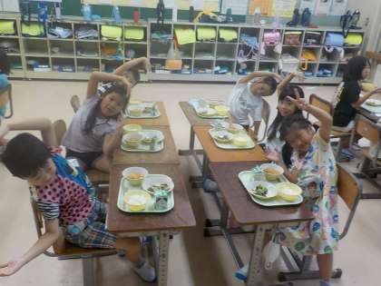 きのうから2学期の給食が始まりました。子供たちはおいしそうに食事をしていました。