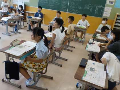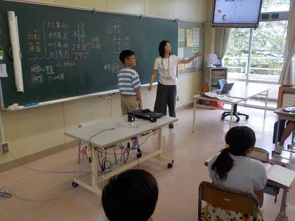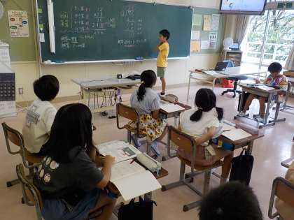 4年生は算数科でこれまで学習した四則計算を振り返りました。4年1組の算数科の学習は10月末日まで、大崎教頭先生が授業を行います。