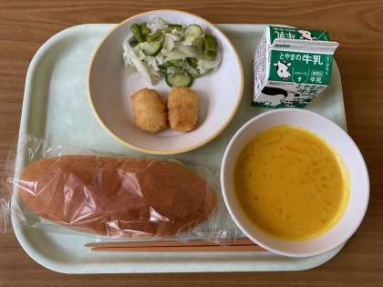 今日の給食のメニューは コッペパン 牛乳 チキンナゲット かぼちゃポタージュ です。