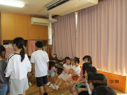 フルーツが書かれた紙のうらにメッセージを書いたり、クイズがみんなに見えるようにしたりするなど、5歳児の子供たちが楽しめる活動をしました。