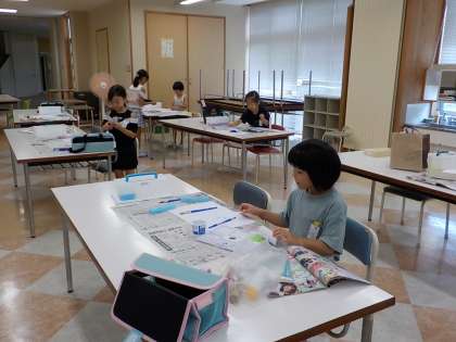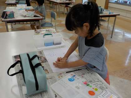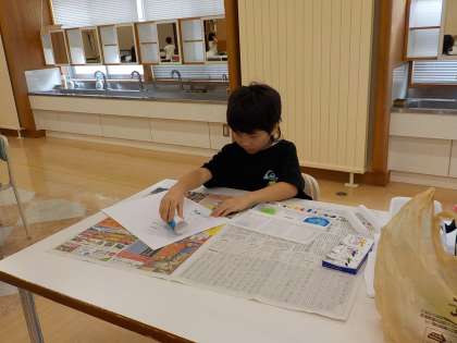 「ぺったんコロコロ」の学習の様子です。トイレットペーパーの芯の縁に絵の具を塗ってスタンプしたり、絵の具の付いたビー玉を転がしたりして楽しみました。持ってきた材料で、どんな形になるのかをたくさん試していました。
