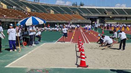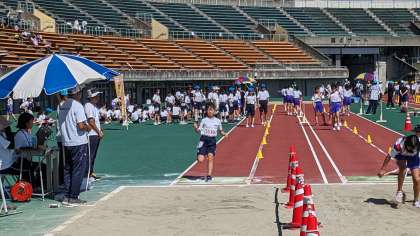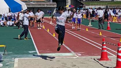 女子走り幅跳びです。ファールに気をつけながら思いっきりジャンプしています。