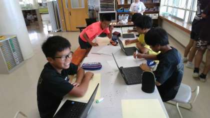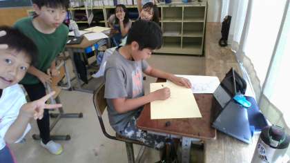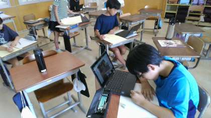 思い出の風景として、今まで勉強してきた教室や、体育館等の絵を描いています。クロームブックで写真を撮り、奥行きを意識しながら取り組んでいます。
