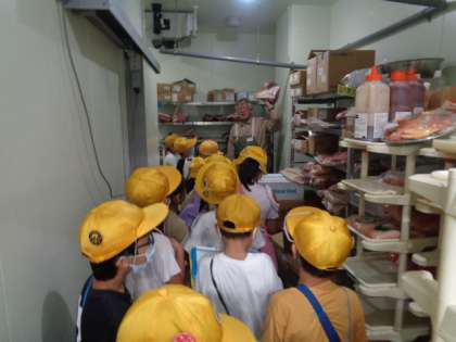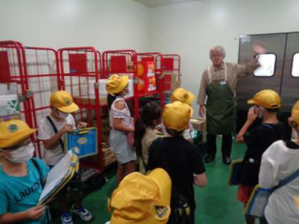 スーパーマーケットにある様々な冷蔵庫を見せていただきました。食品によって温度が違い、寒さに驚いていました。お肉を切る機械や総菜をパックする機械など、普段は見られないものをたくさん見ることができました。