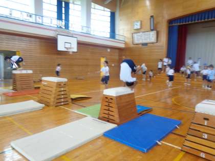 体育は跳び箱に挑戦です。今日はまず、開脚跳びや閉脚跳び、台上前転等、どこまでできるのかやってみました。安全に気を付けて跳んでいます。