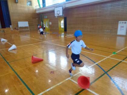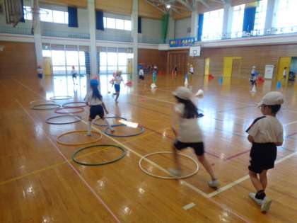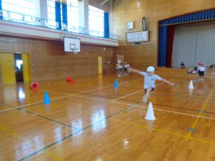 体育では、ミニハードル走に取り組んでいます。フラフープやコーンを利用して、自分たちでコースをつくって走りました。リズムよく走れる人が増えてきました。上手に走っている友達を見付けて、よいところを伝え合うこともできました。楽しくテンポよくできるように頑張りましょう。