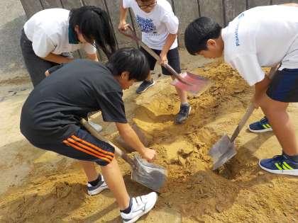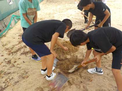 「大地のつくり」の学習で、地層について学習しました。身近なグラウンドの地面の下はどうなっているのか調べました。色や粒の大きさが違うことに気づいていました。