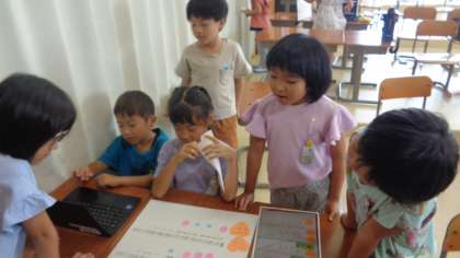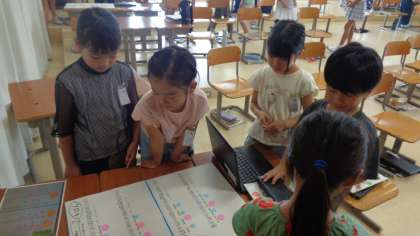 今日は音楽科「あいあいパーク」の最後の時間でした。グループでたくさん工夫したり、歌ったりしていた曲「あいあい」を、1組と2組でお互いに聴き合いました。