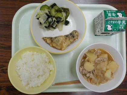 今日の給食メニューは ごはん さばの竜田揚げ 酢の物 豚肉の炒め煮 牛乳 です。