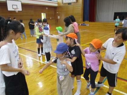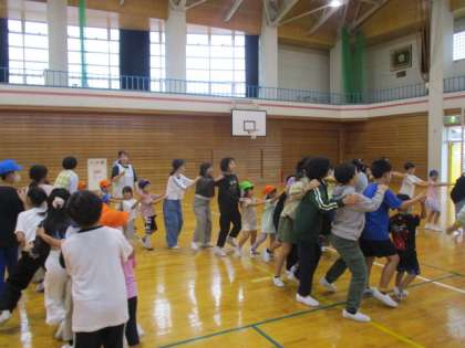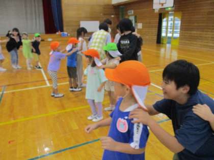 貨物列車の様子です。5年生と園児がお互い名前を呼び合いながら楽しく遊んでいます。