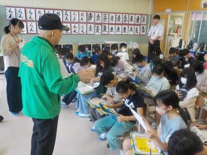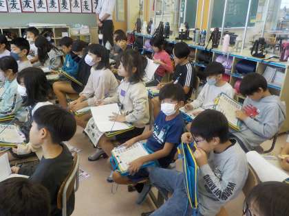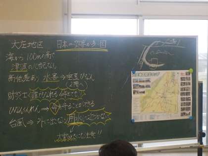 「自然災害からくらしを守る」をテーマに学習をしています。今日は、大庄地区の防災士である谷口さんを招き、大庄地区の災害の危険性や、どのようにしてくらしを守るとよいかについてお話を聞きました。