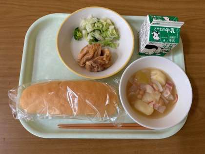 今日の給食メニュー:10月9日(水) 公開日 2024/10/09 更新日 2024/10/09 全校 今日の給食のメニューは コッペパン 牛乳 フライドチキン そえ野菜 豆とベーコンのスープ煮 です。