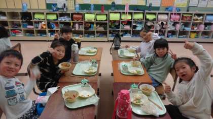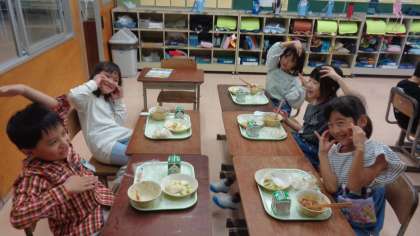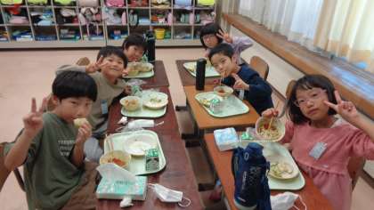 今日は1年生にとって初めてのメニューばかりでした。「ソフトめんおいしい!」「むしパンもおいしいよ!」「サラダにリンゴが入ってる!」と、とても楽しそうに食べている姿が見られました。