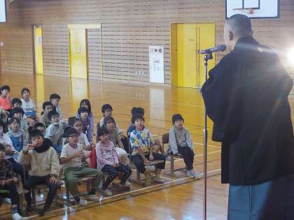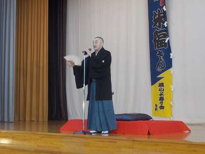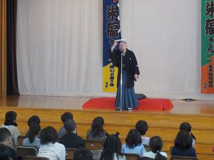 富山市出身の落語家「桂 米福」さんを迎え、落語講演会を行いました。落ちのある小話を体験したり、落語で使う扇子や手ぬぐい、昇り旗等の話を聞いたりしました。