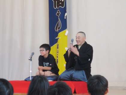 落語を楽しむ会があり、5年生の代表児童が落語体験をしました。