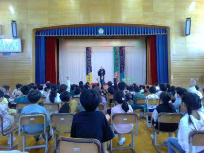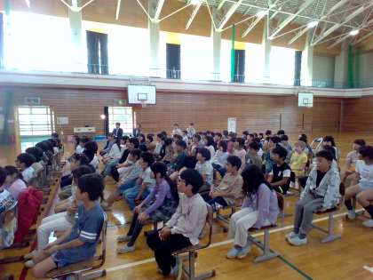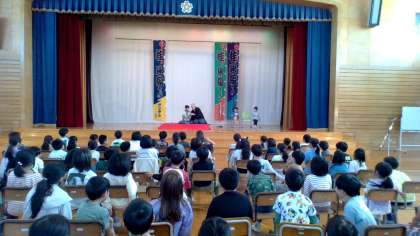 落語の楽しみ方を教えてもらったり、小噺を聞いたり、児童代表による落語体験があったりしました。