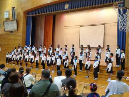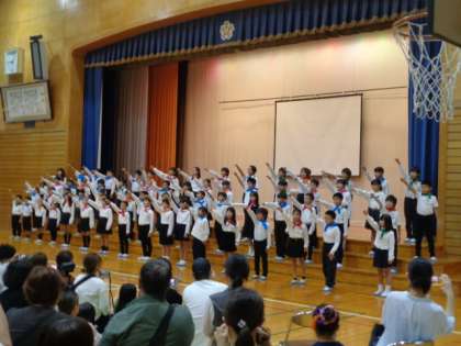 3・4年生は、合唱を行いました。音楽会に引き続き、「ぼくらはみらいのたんけんたい」では、明るく元気な歌声やふりつけを披露しました。「みつけよう大切なもの」では、美しい歌声を響かせることができました。いろんな場面でリードしてくれた4年生と、しっかりとついていくことができた3年生。すてきな姿がたくさんみられて嬉しかったです。