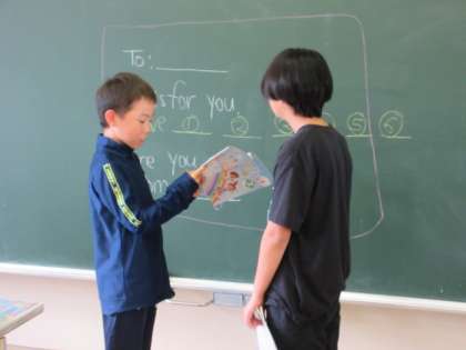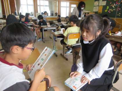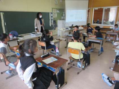 外国語では、文房具の英語での言い方を学習しました。ペアになり、自分の筆箱の中身を英語で伝え合いました。